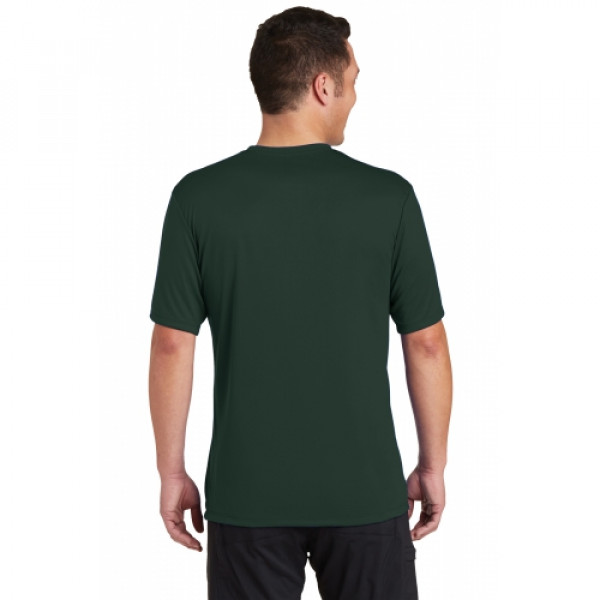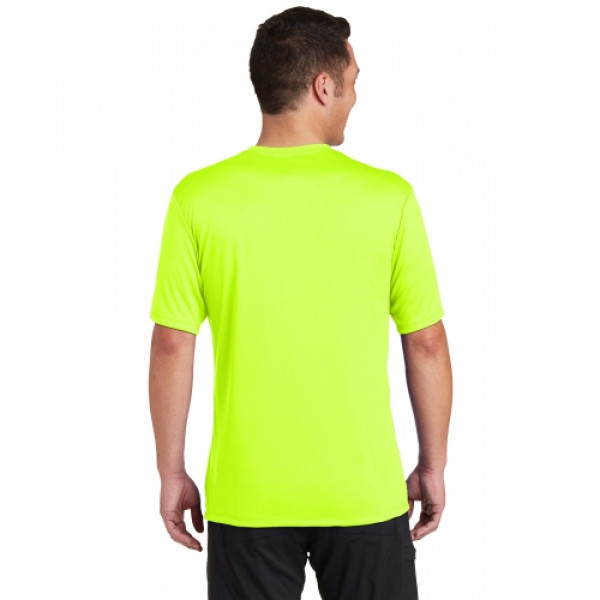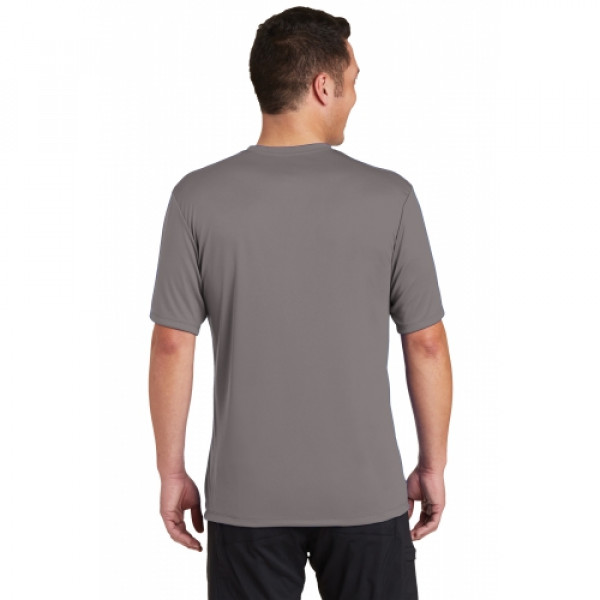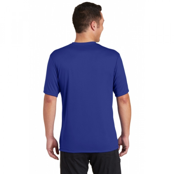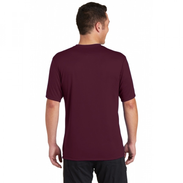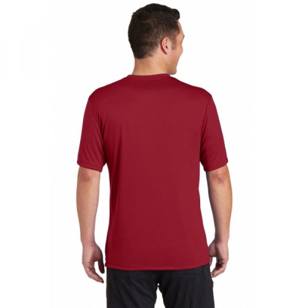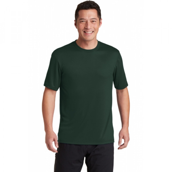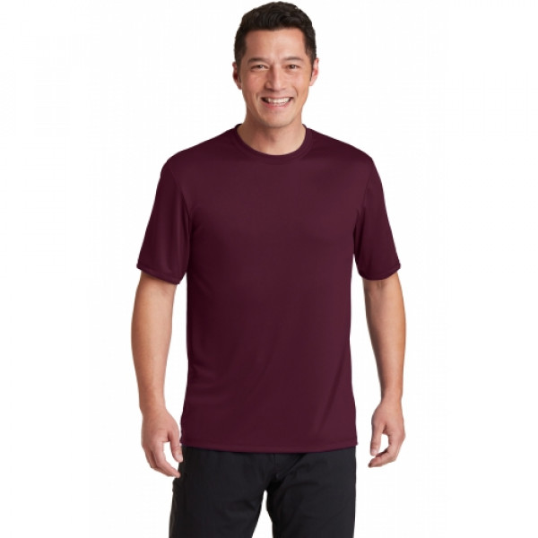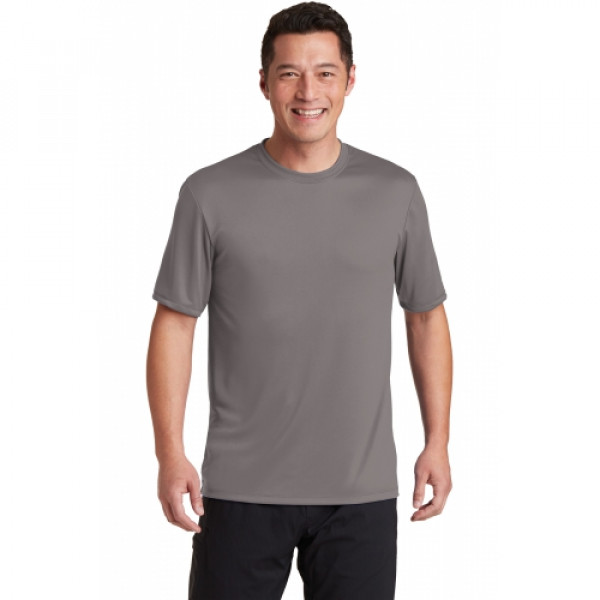 A soft cotton hand merges with color-locking, moisture-wicking performance in this tee that also has a matte finish.::4.7-ounce, 100% spun polyester jersey with PosiCharge technology::Soft cotton hand::Removable tag for comfort and relabeling::Dyed-to-match neck taping::Set-in sleeves
