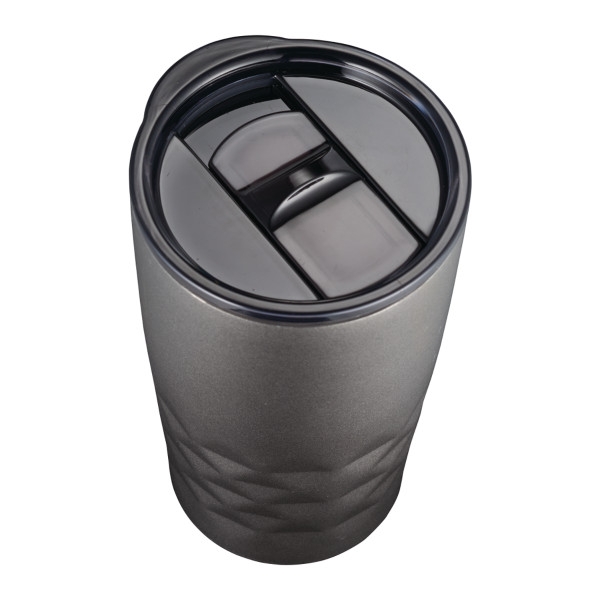 Double-wall vacuum construction with copper insulation. Keeps drinks hot for 8 hours and cold for 24 hours. The construction also prevents condensation on the outside of the tumbler. Compact design fits easily under most single cup or K-cup coffee makers as well as in all standard cup holders. Easy sipping, push-on lid with slide closure. Wide opening for comfortable filling and pouring. 14oz.Details