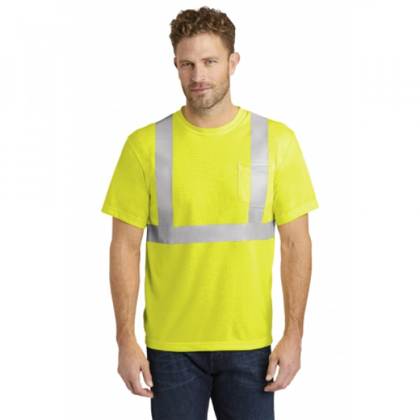 Stay safer on the jobsite in this high-visibility t-shirt that works as hard as you do.| ANSI/ISEA Class 2 certified 5.9-ounce 100% polyester interlock Wicks moisture 2-in. wide reflective taping on front and back Left chest pocket for pens and notes