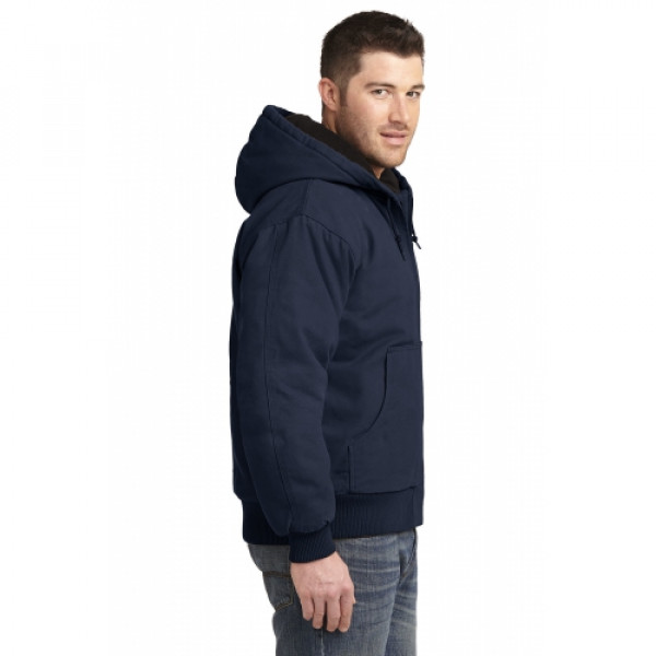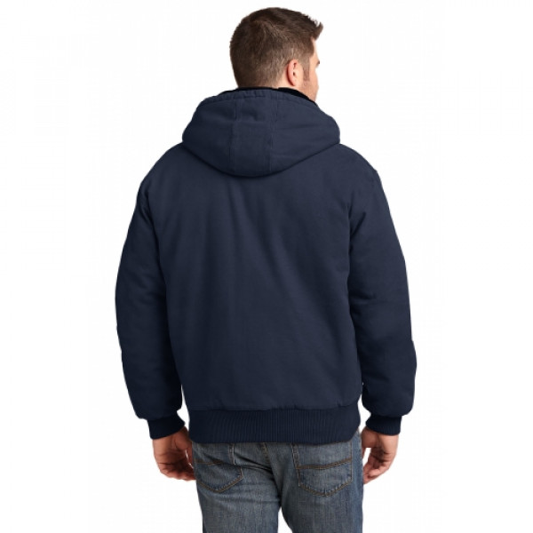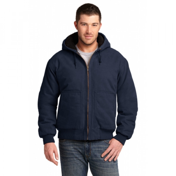 Proven to work hard, this enzyme-washed hooded jacket has a supple worn-in look, while maintaining the toughness of duck cloth. Brushed, quilted lining and insulation throughout keeps you warm and comfortable as you tackle the job.::12-ounce, 100% cotton enzyme washed duck cloth::100% polyester tricot body and hood lining with 8-ounce polyfill::100% quilted polyester sleeve lining with 6-ounce polyfill::Hood with antique brass eyelets and dyed-to-match drawcord::Rib knit cuffs and waistband::Front pouch pockets::Interior zippered pocket::Port Pocket™ for easy embroidery access