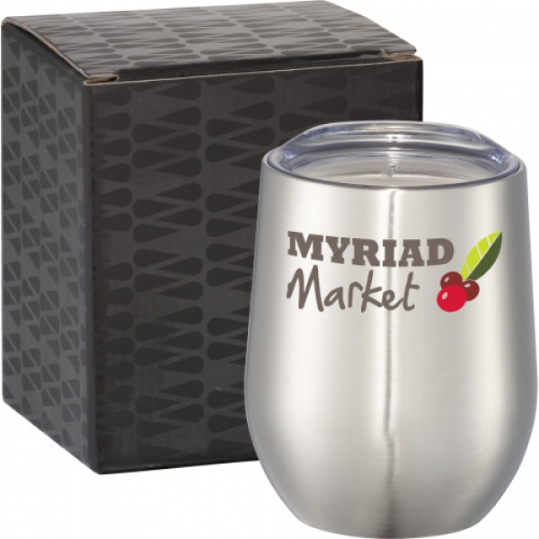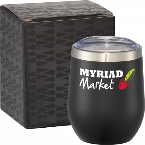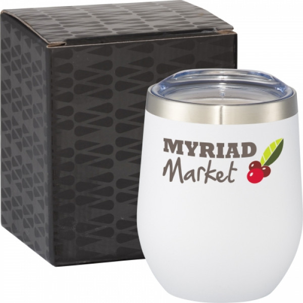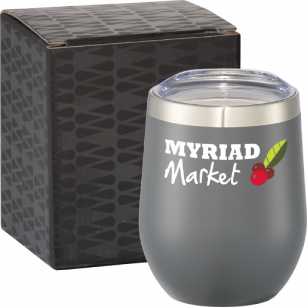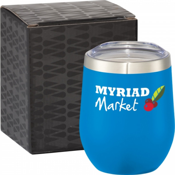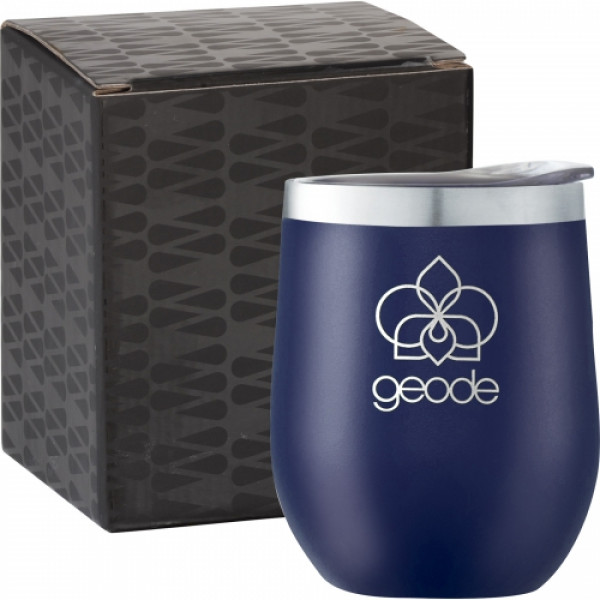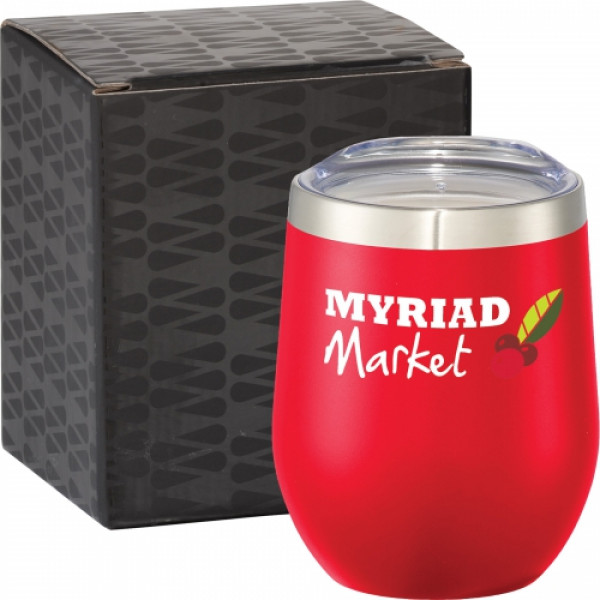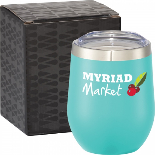 Enjoy your drink at any moment! ::Durable, double-wall 18/18 stainless steel vacuum construction with copper insulation, which allows your beverage to stay cold for 24 hours and hot for at least 6 hours. ::The construction also prevents condensation on the outside of the tumbler. ::Perfect accessory for wine. Easy sipping, push-on lid. ::Wide opening for comfortable filling and pouring. Durable powder spray color. 12oz.
