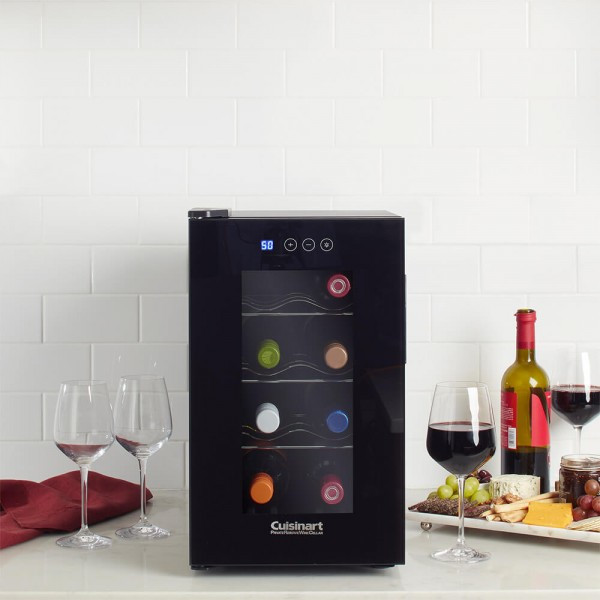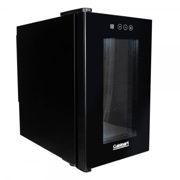 Preserve wines flavor, bouquet, and body in style! The Cuisinart® 8 Bottle Private Reserve Wine Cellar combines technological sophistication with ease and convenience. Engineered for optimal efficiency, this compact wine showcase stores up to 8 reds, whites, and Champagnes at their ideal temperature. At the touch of a button, the desired temperature is set between 39°F to 68°F and is quietly maintained by a thermoelectric cooling system that conserves energy without sacrificing performance. Sleek black housing with soft interior lighting and contoured chrome racks make this wine cellar a handsome, on-trend addition to any home.