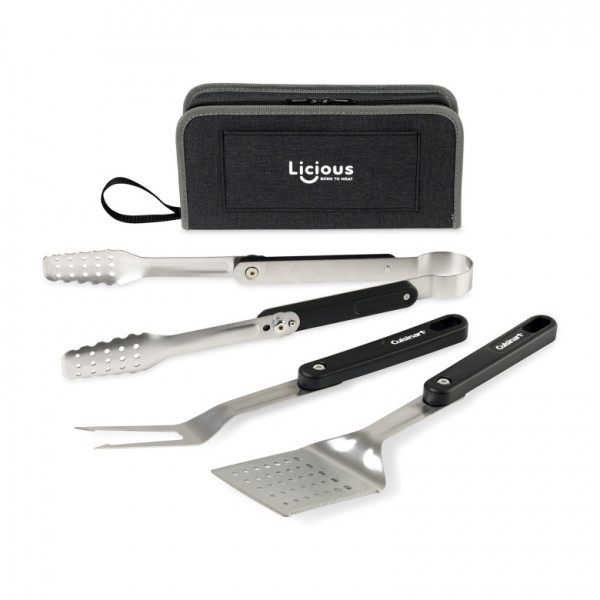 - Includes spatula, tongs, fork, and carrying case