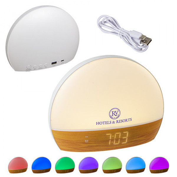 Wake up naturally and stay organized with this multi-function sunrise simulation alarm clock. With a sleek bamboo finish and customizable lighting options, this clock not only enhances your space but also provides practical features like temperature display, day/date tracking, and device charging. Perfect for home or office, it blends functionality with soothing aesthetics.