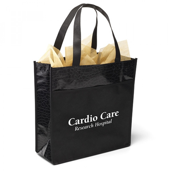 105 GSM gloss laminated tote with large non-woven polypropylene pocket on front for your imprint. 18" handles. ::Optional plastic bottom insert available.
