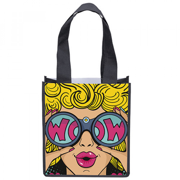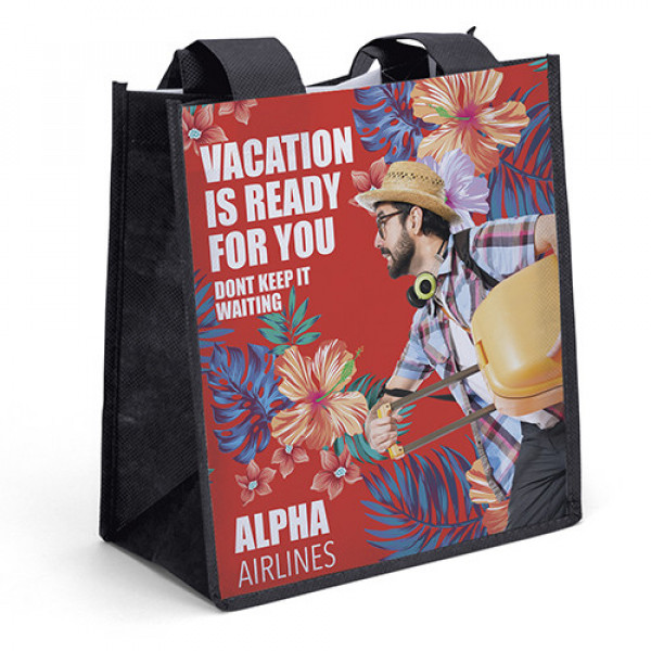 This 80 GSM PET non-woven bags features white front and back panels, accented by black gussets, piping, and handles. 1.5"-wide x 20"-long handles.