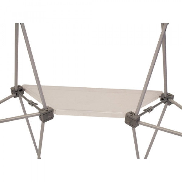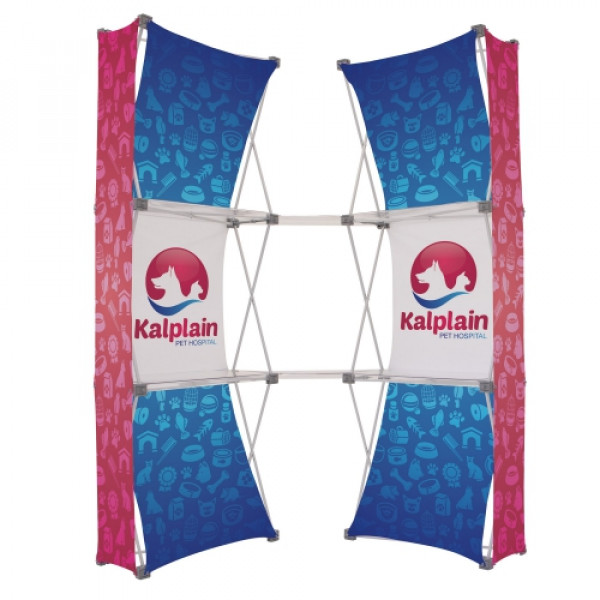 This brilliant display option features multiple frames linked together with connector shelves. Edge graphic panels complete the look.::The Deluxe GeoMetrix Narrow Corner Connector kit includes two 3-quad tower frames, two H panels, two M panels, four internal shelves and two connector shelves::Also includes 32 corner faceplates::Deluxe GeoMetrix frames are stronger and more durable than standard GeoMetrix frames::Hubs feature patented interchangeable faceplate design::Deluxe GeoMetrix pegs hold up to six panels each::Artwork is dye sublimated on polyester double knit::Graphic panels are finished with white stitching only::Graphic panels are designed to be applied at specified angles::Each connector shelf holds up to 5 lbs.; each internal shelf holds up to 15 lbs.::All included shelves are clear::Two soft carry cases included::The included carry cases will not hold the shelves; soft case (item #220101, sold separately) is recommended for the shelves::US Patent #9214104