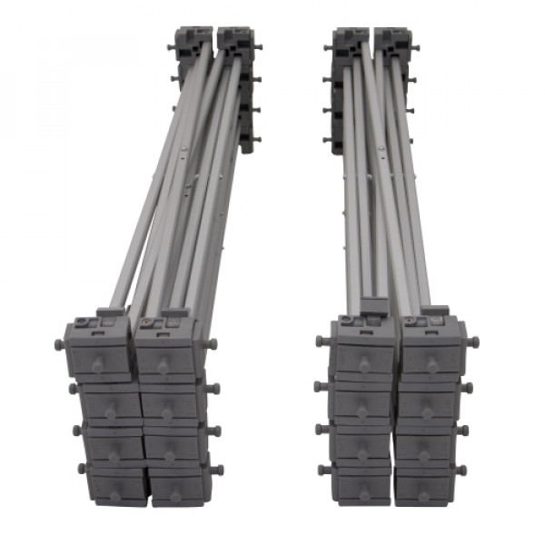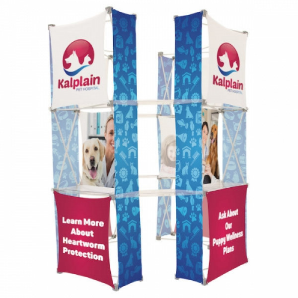 This brilliant display option features multiple frames linked together with connector shelves. Edge graphic panels complete the look.::The Deluxe GeoMetrix Ring Connector kit includes four 3-quad tower frames, 36 graphic panels, four internal shelves and eight connector shelves::Also includes 64 corner faceplates::Deluxe GeoMetrix frames are stronger and more durable than standard GeoMetrix frames::Hubs feature patented interchangeable faceplate design::Deluxe GeoMetrix pegs hold up to six panels each::Artwork is dye sublimated on polyester double knit::Graphic panels are finished with white stitching only::Graphic panels are designed to be applied at specified angles::Each connector shelf holds up to 5 lbs.; each internal shelf holds up to 15 lbs.::All included shelves are clear::Four soft carry cases included::The included carry cases will not hold the shelves; soft case (item #220101, sold separately) is recommended for the shelves::US Patent #9214104