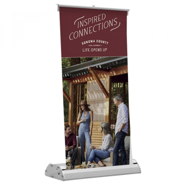 This mini retractor can be used even when space is limited, and it works great as a tabletop display.::Printed on tear-resistant Titan™ polypropylene media::Banner is single-sided::Aluminum base::Shock cord pole folds down into the base for easy, compact storage::Lightweight and portable