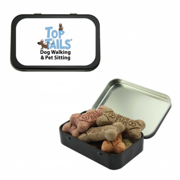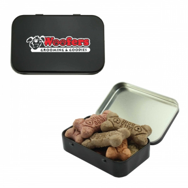 ::The tin is made in China and the dog bones are made and filled in the USA.::Dog Bones treats in a large silver tin.::Cookie and snack treats for the unconditional love our dogs give us.