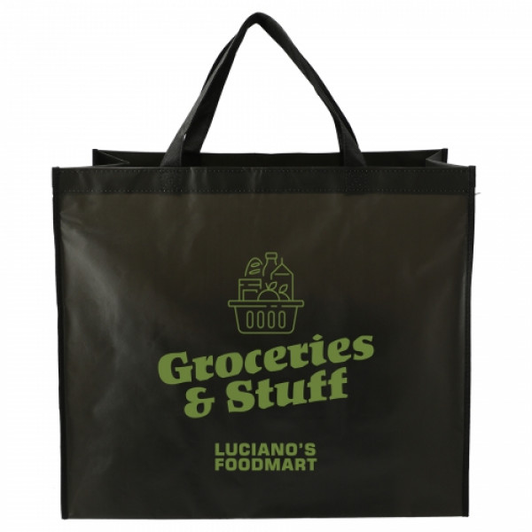 The Double Laminated Wipeable Jumbo Tote features an easy to wipe surface that makes it perfect for taking to the grocery store. This tote has double handles an open main compartment and a supportive bottom board.