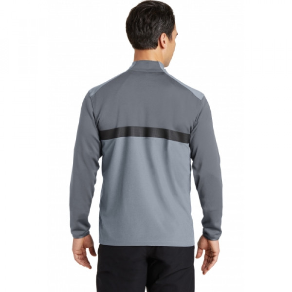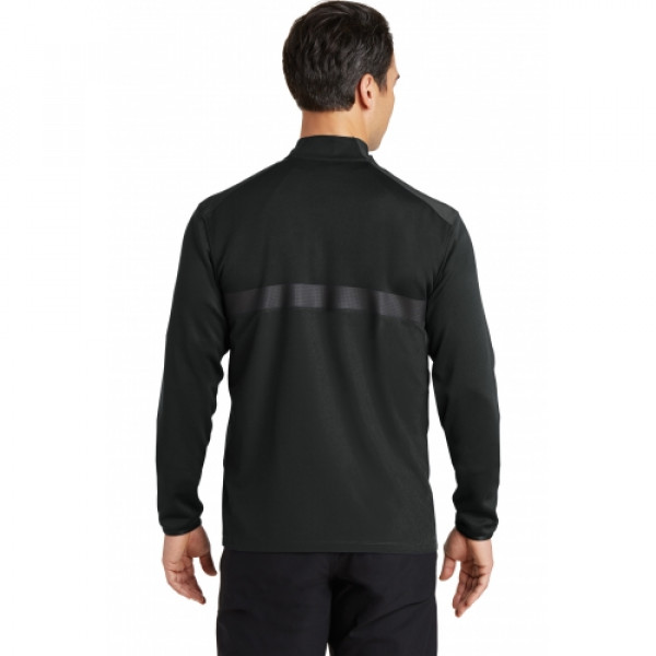 Combining a stretch woven a comfortable knit and welded details this cover-up delivers a broad range of motion with a technical look. Dri-FIT moisture management technology ensures pure performance. The design features a reverse coil zip-through collar open cuffs and an open hem. The welded contrast Swoosh design trademark is on the left sleeve. Body made of 4.7-ounce 90/10 polyester/spandex; upper back panel and sleeves made of 6.9-ounce 100% polyester Dri-FIT fabrics.