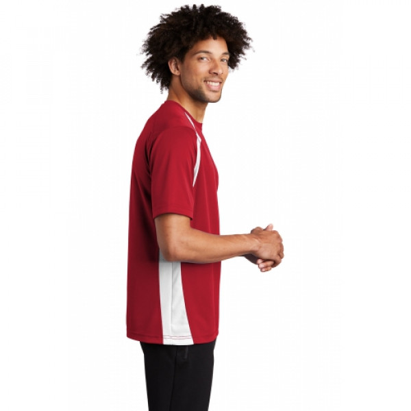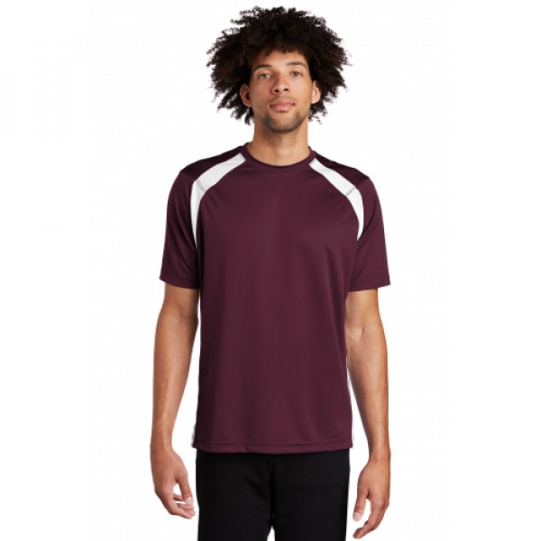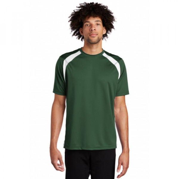 Look to our Dry Zone Colorblock Crew for moisture-wicking, odor fighting performance. Contrast colorblock side panels give this shirt an athletic edge while a raglan sleeve on the front and set-in construction on the back offer easy movement and a better fit. ::3.8-ounce, 100% polyester:: Loose athletic fit ::Double-needle stitching throughout ::Tag-free label ::Modified raglan sleeves ::Due to the nature of 100% polyester performance fabrics, special care must be taken throughout the screen printing process.