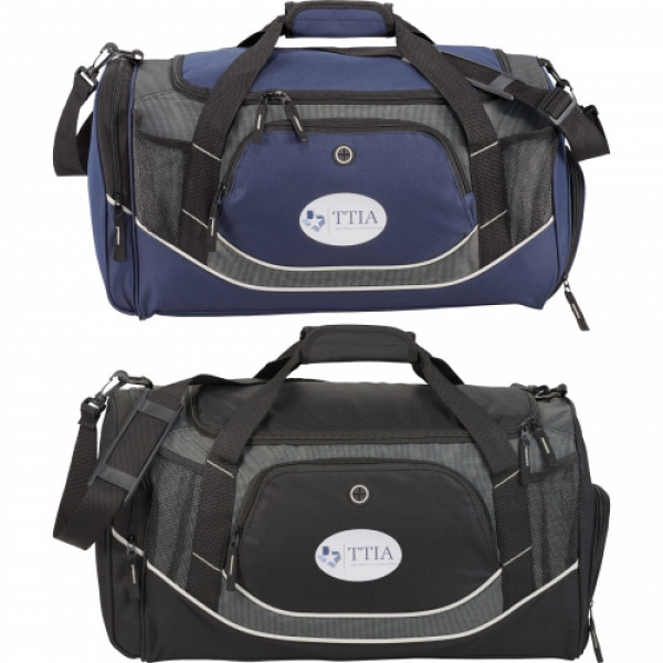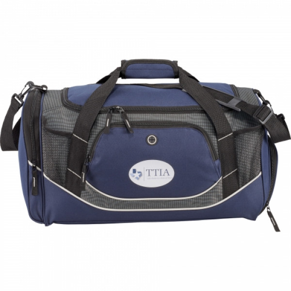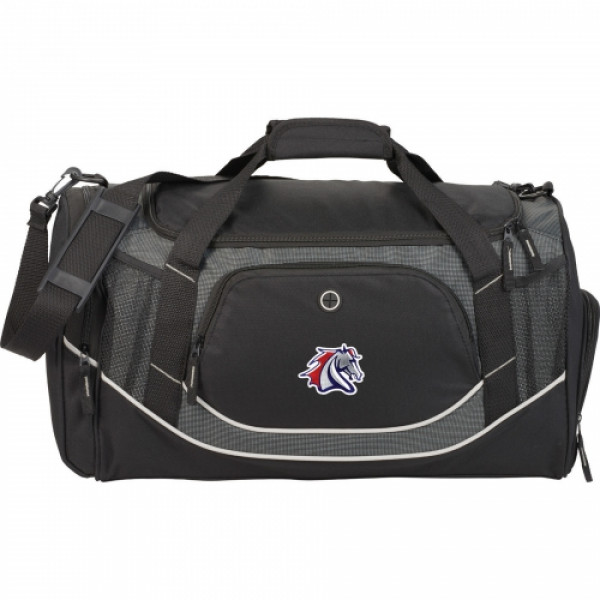 ::Zippered U-shaped main compartment. ::Two zippered side pockets (one with shoe pouch). ::Front zippered pocket with mesh accessory pockets inside and an earbud port. ::Two front mesh pockets for accessories or water bottle. ::Haul handle with comfort wrap. ::Detachable, adjustable shoulder strap.
