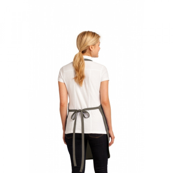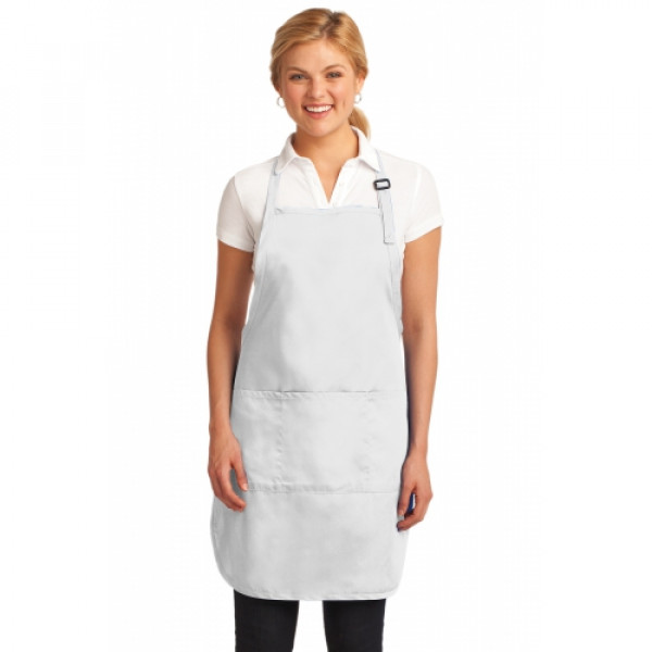 Protect your clothes in our full-length stain-release and wrinkle-fighting apron.::8-ounce, 65/35 poly/cotton twill::Adjustable neck strap::Three front pockets::22"w x 30"l