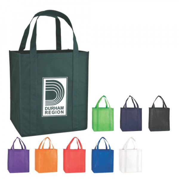 ::Made from sturdy 80gsm non-woven polypropylene::Dual reinforced 18" carrying handles, large side and bottom gussets, and bottom insert::Can hold up to 20 lbs of groceries