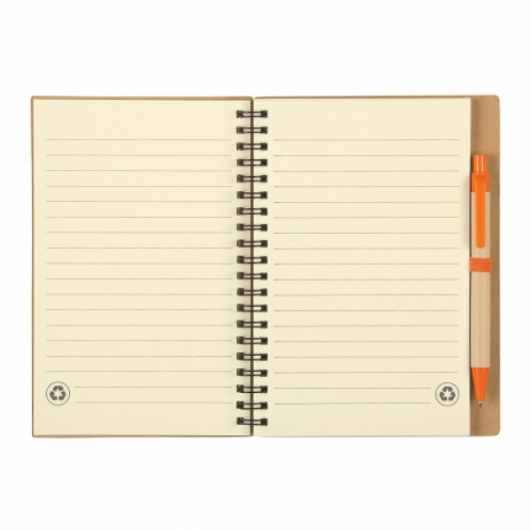 Get ready to make eco-friendly notes in style with our custom promotional Eco-Inspired Spiral Notebook & Pen! This trendy notebook features 60 lined pages that are perfect for jotting down your thoughts and ideas. The matching pen with a paper barrel is conveniently stored in an elastic pen loop, ensuring you always have a pen handy. Plus, with the recycling symbol proudly displayed on the bottom corner of the pages, you can feel good about choosing a sustainable option. Stay organized and stay green with this must-have notebook!