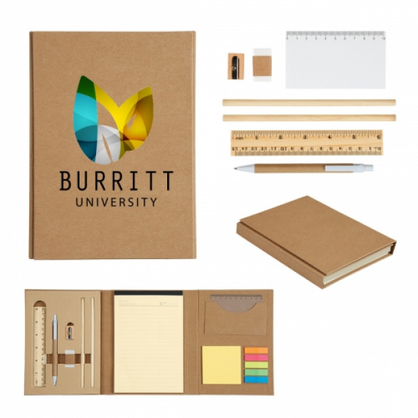 ::Includes: 6" Wooden Ruler, 4" Clear Ruler, 2 Unsharpened Pencils, Eraser, Wooden Pencil::Matching Pen Has Paper Barrel::Sharpener And 45 Page Lined 5" x 8" Writing Pad::Sticky Flags In 5 Neon Colors::Sticky Notes