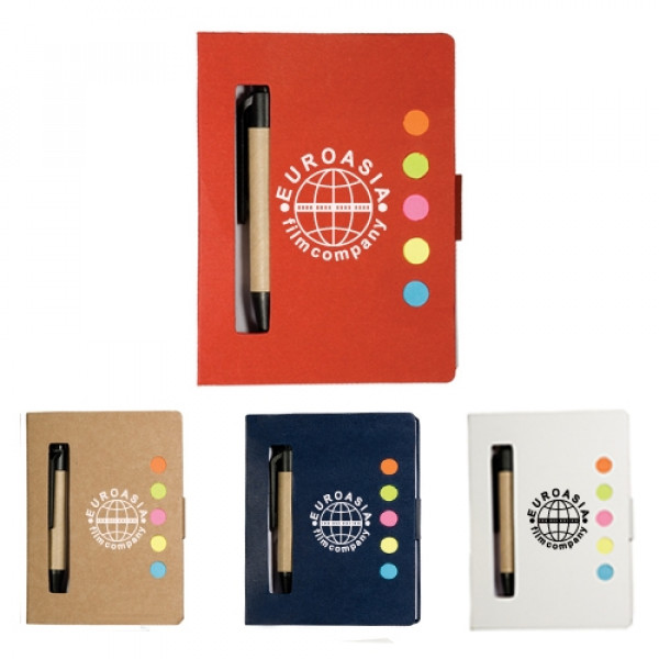 ::An Eco-Responsible™ product.::Includes five assorted neon sticky page flags, a 3" x 4"white perforated 80-sheet pad, and a mini paper barrel ballpoint pen in a recycled cardboard cover.::Pen nestled in special die-cut slot and features black medium point ink::Tuck-in flap closure::Optional imprint on pen available for an additional fee.