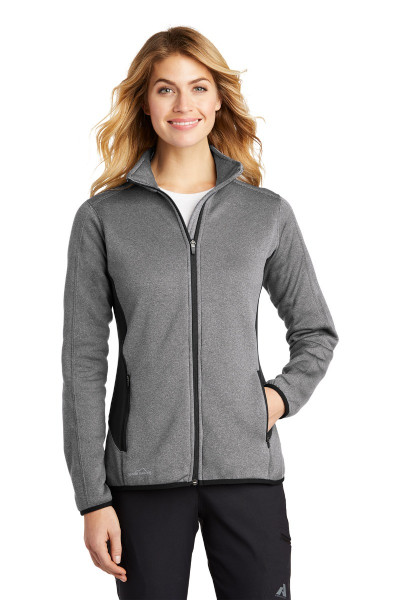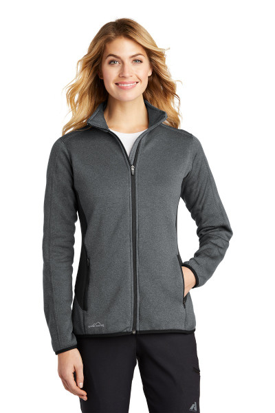 Black contrast details at side panels, locking reverse coil zippers and stretch binding at cuffs and hem. Front zippered pockets. Contrast Eddie Bauer heat transfer logo on the right hem. Made of 5.6-ounce, 95/5 poly/spandex fleece.Details