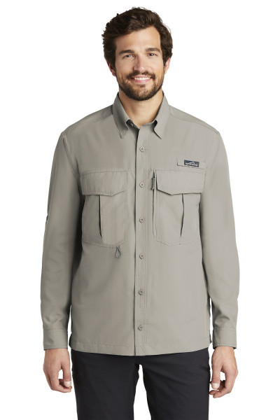 2.3-ounce, 100% polyester ripstop 100% polyester mesh upper back lining Sun shield collar Built-in rod holderTwo large fly box pockets with hook and loop closures Zippered chest pocket Utility loop and tool holder Cape back with mesh ventilation Hook and loop-fastened collar points Roll sleeves with button tabs Eddie Bauer logo at left chestDetails