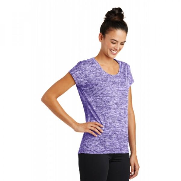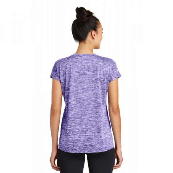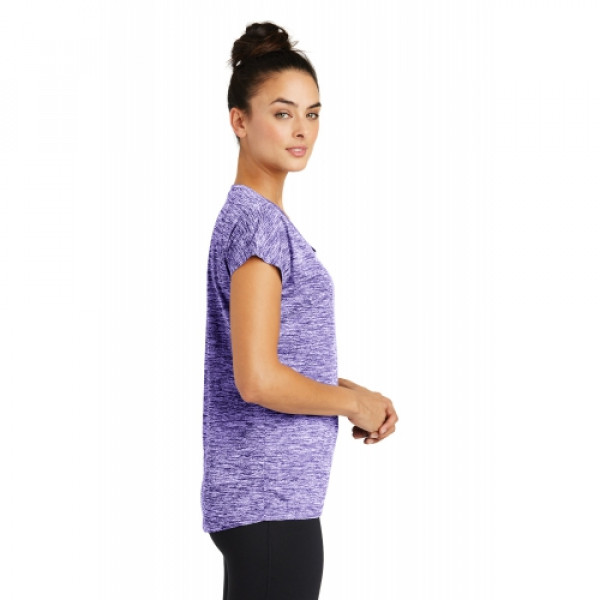 Our color-locking tee has a soft hand, wicks moisture, resists snags and is energized with an allover heather pattern.::4.1-ounce, 100% polyester jersey with PosiCharge technology::Gently contoured silhouette::Removable tag for comfort and relabeling::Scoop neck::Dolman sleeves::Choose from 10 colors