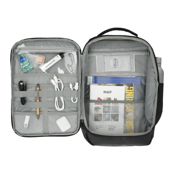 The exterior is made from 305D bluesign® fabric and features a wipeable tarpaulin bottom. Keep must-haves in the front zippered pocket and your favorite reusable drinkware in the side water bottle pocket. The main compartment has plenty of storage space and makes it easy to stay organized. The front wall of the main compartment includes a zippered PVC pocket, daisy-chain webbing, two slash mesh pockets, and a larger slash pocket. On the back wall, you'll find a large zippered mesh pocket, another slash pocket and another mesh pocket. A dedicated padded laptop compartment keeps your laptop separate from the other day-trip essentials. The padded back panel and shoulder straps make this bag comfortable to carry all day long.Details