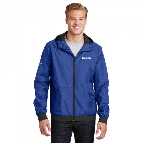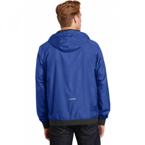 This wind-resistant water-repellent jacket delivers powerful performance and features an embossed geometric pattern and reflective details for an unrivaled look. ::100% polyester embossed woven body::100% polyester mesh body and hood lining ::100% polyester woven sleeve lining ::Three-panel hood with drawcord and toggles ::Tag-free label ::Raglan sleeves ::Reverse coil zipper ::Reflective details on right sleeve and lower back ::Elastic trim at cuffs and hem ::Front zippered pockets