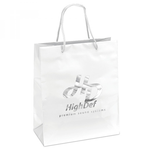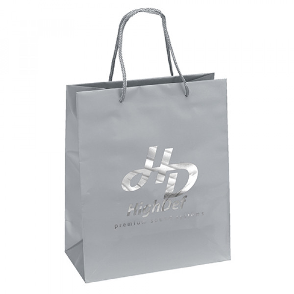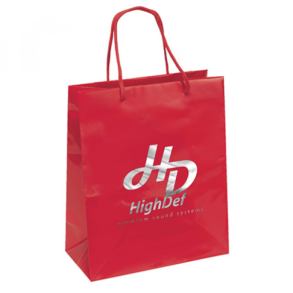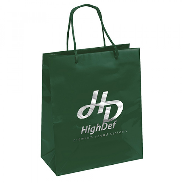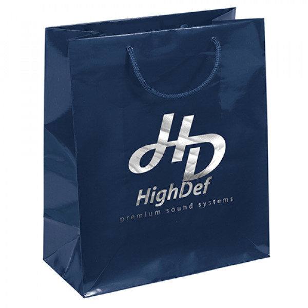 ::Premium weight gloss laminated eurotote::Matching macramé handles::Reinforced fold-over top and cardboard bottom insert::Available in black, white, red, blue, silver, and green