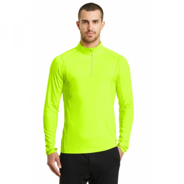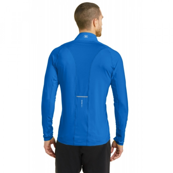 STAY-COOL WICKINGODOR CONTROLZONED VENTILATIONSTRETCHFLATLOCK SEAMS FOR COMFORTREFLECTIVE DETAILS::5.6-ounce, 88/12 poly/spandex jersey body::4.1-ounce, 92/8 poly/spandex mesh panels::Reflective taping at zipper and back panel::Mesh at center back and under arms::Reflective O heat transfer at back neck::Reflective stacked O heat transfers at back and sleeves::OGIO Endurance heat transfer label for tag-free comfort::Modified raglan sleeves with thumbholes for warmth::Slight drop tail hem::Reflective O Endurance heat transfer at right hem