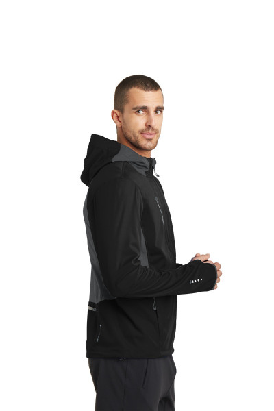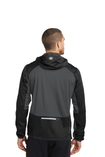 ::WATER-RESISTANT::WIND-RESISTANT::HOOD PIVOTS FOR CLEARER PERIPHERAL VISION::STRETCH::REFLECTIVE DETAILS::100% poly interlock bonded to poly interlock with a laminated film insert for wind and water resistance::3000MM fabric waterproof rating::3000G/M2 fabric breathability rating::Articulated shaping for ease of movement::Reflective OGIO Endurance heat transfer label for tag-free comfort::Reflective O heat transfer at hood::Reflective zippered chest pocket and back stash pocket::Lower front zippered pockets::Set-in sleeves with shaped cuffs, thumbholes for warmth and embossed OGIO detail at binding::Reflective stacked O heat transfers at sleeves::Slight drop tail hem with reflective O Endurance heat transfer at back left hem