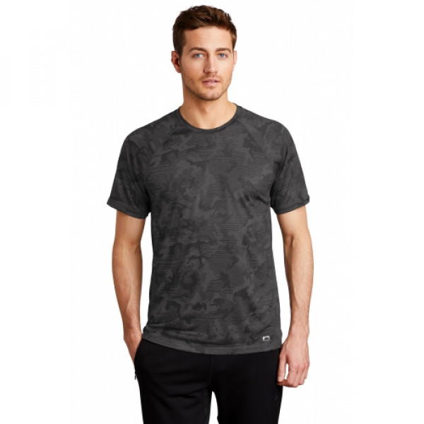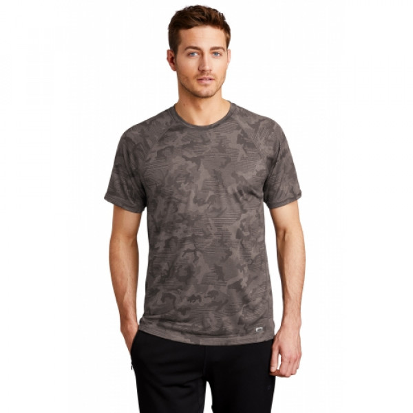 STAY-COOL WICKINGULTRABREATHABLEFLATLOCK SEAMS FOR COMFORTREFLECTIVE DETAILS::4-ounce, 100% poly with stay-cool wicking technology::Sublimated tonal camo print::OGIO heat transfer label for tag-free comfort::Raglan sleeves with flatlock stitching::Reflective O heat transfer on left hem::Reflective OGIO Endurance vertical bar heat transfer on center back