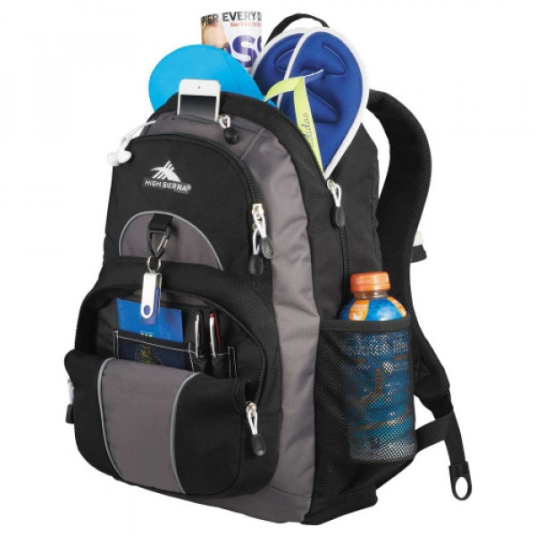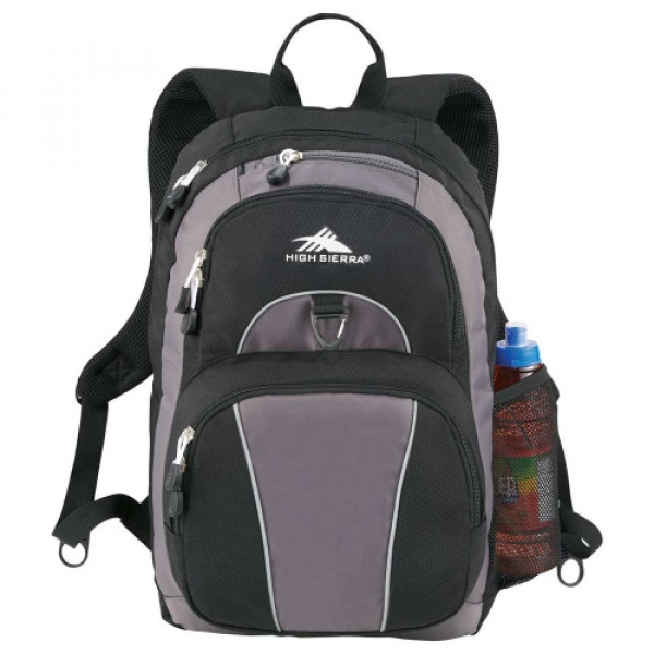::The High Sierra® Enzo Backpack is a multi-compartment backpack that features two large main compartments and an organizer compartment with pen pockets. ::Top zippered accessory pocket are also offered with a headphone port. Large gusseted side mesh beverage pocket. ::Comfort is provided by S-shaped padded shoulder straps, a padded back panel and a heavy duty webbing grab handle.::Signature High Sierra hardware. Includes lifetime warranty.