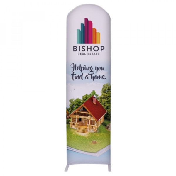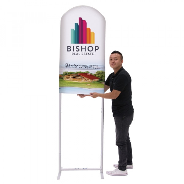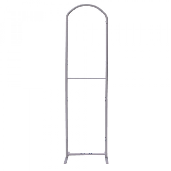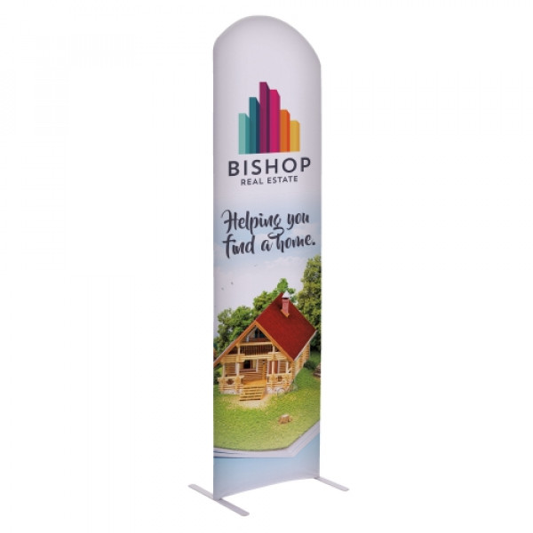 This display features a gentle arc at its top for a variation on traditional rectangular displays; it looks great in any environment.::This display is approximately 90" tall::Artwork is dye sublimated on polyester knit::Double-sided graphic cover is viewable from both the front and back of the display::Graphic cover slips over the frame like a pillowcase::Fabric contours to the frame for a form-fitted look::Lightweight aluminum frame::Joints are labeled for step-by-step frame assembly::Push-button connectors make assembly a snap::Hinge together multiple EuroFit displays with the included EuroFit Connector (US Patent #9637963)::Slim swivel feet allow EuroFit Walls to be paired at angles