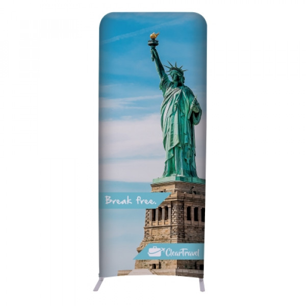 Use this straight wall in a setting with ample display space. This double-sided display is lightweight and stylish.::This display is approximately 90" tall::Artwork is dye sublimated on polyester knit::Double-sided graphic cover is viewable from both the front and back of the display::Graphic cover slips over the frame like a pillowcase::Fabric contours to the frame for a form-fitted look::Lightweight aluminum frame::Joints are labeled for step-by-step frame assembly::Push-button connectors make assembly a snap::Hinge together multiple EuroFit displays with the included EuroFit Connector (US Patent #9637963)::Slim swivel feet allow EuroFit Walls to be paired at angles