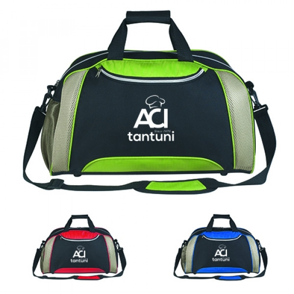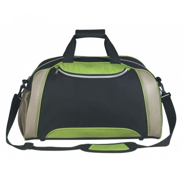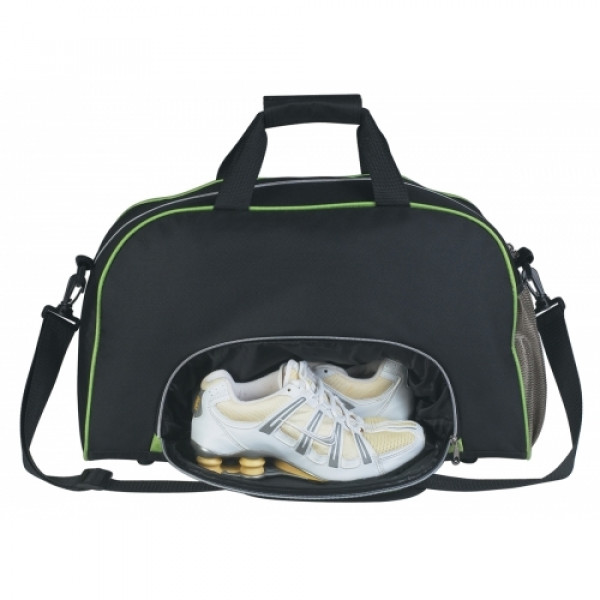 ::Made Of 600D Polyester And 420D Nylon Ripstop::Top Zippered Compartment::Detachable/Adjustable Padded Shoulder Strap::Web Handles With Velcro® Closure::Shoe Compartments With Air Vents::Side Pocket For Water Bottle, Cell Phone, Etc.::Black trim and gray mesh