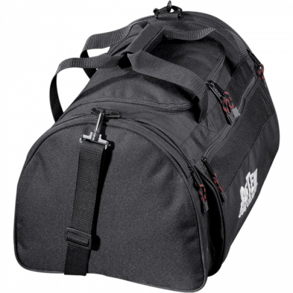 ::Zippered main compartment. ::Zippered front and end pockets. ::Detachable, adjustable shoulder strap.