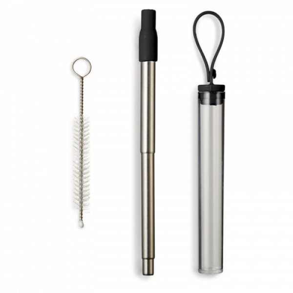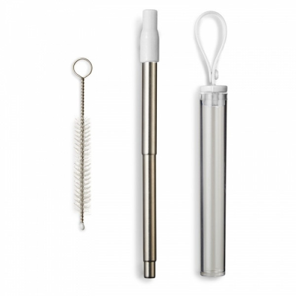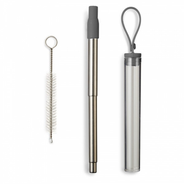 ::Set includes reusable Stainless Steel drinking straw with cleaning brush in PS Plastic Case.::Telescopic 304 Stainless Steel straw with Silicone spout is compact for using on-the-go::Case includes Silicone clip on lid::Brush comes inserted at Silicone spout end of folded straw and is made of Stainless Steel with Nylon yarn.::Straw measures approx. 8.25"l x 0.3"dia. at full length (3.15"l folded).::Brush measures approx. 3.5"l x 0.25"dia.::Hand-wash only.