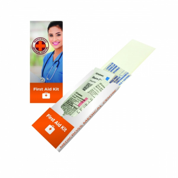 ::Includes one band aid bandage, first aid cream, 1% cortisone cream, and burn cream::Four color printing on one side of the box::Great for the outdoors, traveling, and having on hand for first aid emergencies