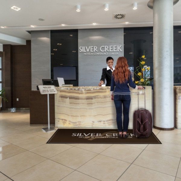 Put quality designs right at your feet. Floor Hugger mats feature a nylon yarn surface with black rubber borders and backing.::Designed for indoor use only::Features high-definition plush floor mat printing::Artwork is printed on the top of the mat only::The full thickness of the mat is 5/16", and the outside border is 1/2" wide::Treated with Stainstopper™ and static dissipative::Will not crack or curl::Complies with requirements set by the ADA (Americans with Disabilities Act)::NFSI (National Floor Safety Institute) certified::Mat sizes are not exact; allow 3-5% size variance::Not eligible for Rush Service::150 print colors available
