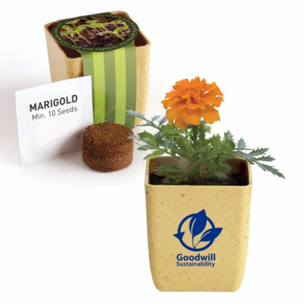 ::Flower pot made from reclaimed organic materials including bamboo and corn fiber. ::Each set includes a biodegradable planter, a compressed soil wafer and a marigold seed packet.