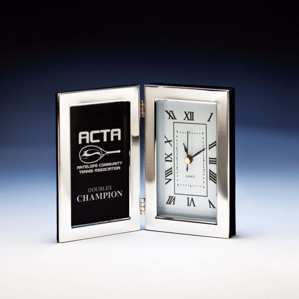 Classic silverplate clock folds like a book. Left side of the clock provides a large engraving area to fit all of your event information.