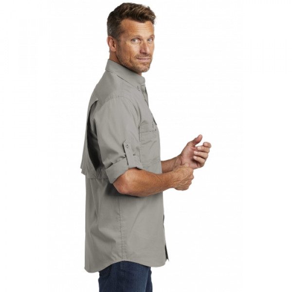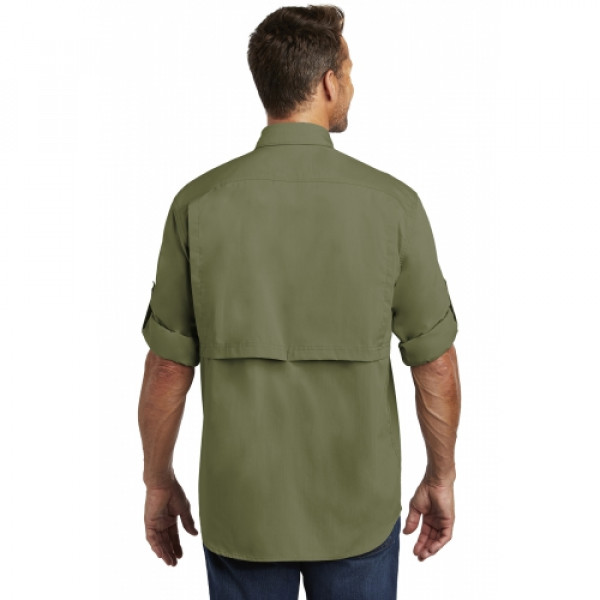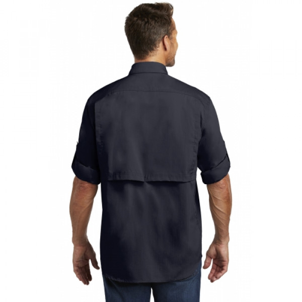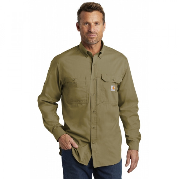 Don’t let the heat stop you from a long day outdoors. The Ridgefield wicks sweat, releases stains in the wash and has a mesh-lined back to keep you cool as a catfish.::3-ounce, 60/40 poly/cotton sheeting::FastDry® technology wicks away sweat::Stain Breaker® technology releases stains::Double-layer collar converts to stand-up collar for extra sun protection::Mesh-lined vent at center back for flow-through ventilation::Articulated elbows::Convertible roll sleeves with buttons::Four chest pockets: Left has buttoned-flap pocket with an oversized, concealed, zippered, mesh-lined vertical pocket; Right has two easy-entry pockets: one with button closure, one with hook and loop closure::Contrast color neck piping::Carhartt label sewn on left chest pocket::Carhartt Force® labeling on inner back neck::Relaxed fit