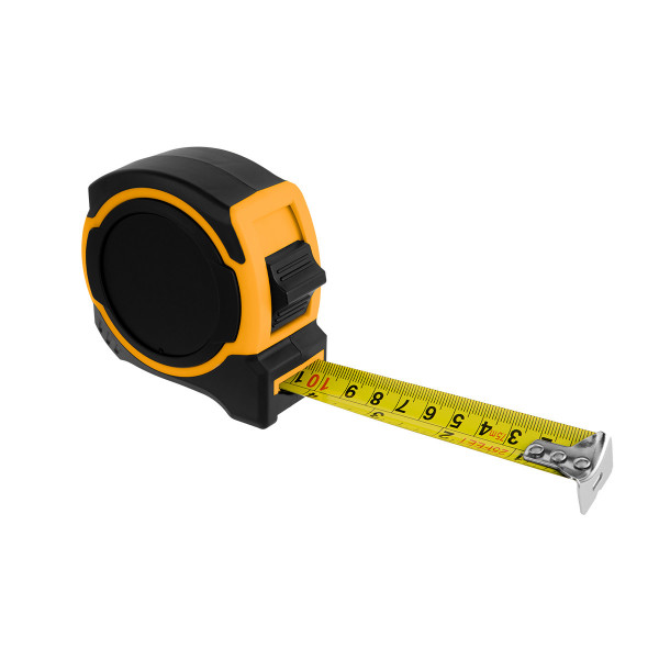 - 25' retractable steel tape with thumb push button locking mechanism