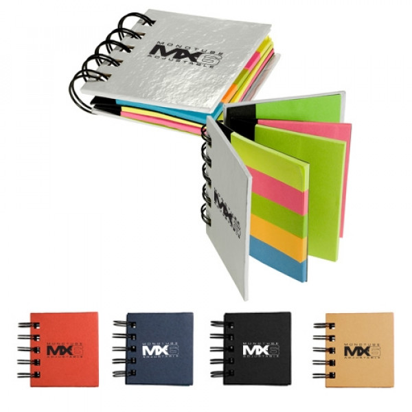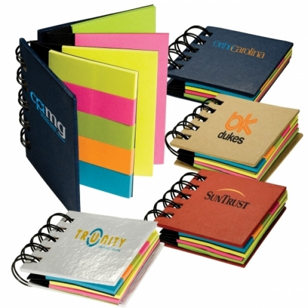 Includes five assorted sticky page flags of 25 sheets and three assorted 3" x 2" sticky pads each mounted on cardboard backing Cardboard cover with double metal ring binding