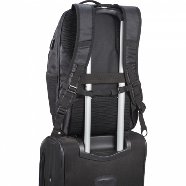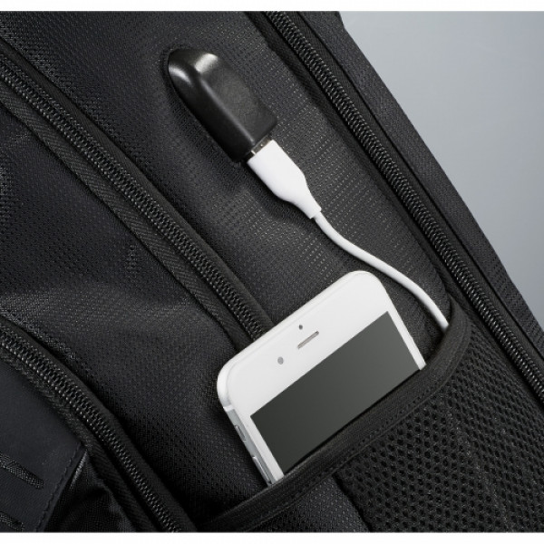 ::The Foyager TSA 15" Computer Backpack features a large zippered main compartment that offers ample room for all of your tech accessories and tablet. ::The main compartment has built in USB port and cable which allows for seamless charging capabilities of your tech products inside the backpack. ::Includes a 15 inch TSA padded computer compartment that unfolds to lay flat on the X-ray belt to increase speed through security.::Additional storage on the front panel of the bag include a deluxe organizational panel, and two side mesh water bottle pockets. ::Custom zipper pullers, padded back panel, chest strap and trolley sleeve.