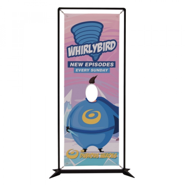Let your guests become part of the show with this creative spin on our traditional FrameWorx display.::Hardware available in black or silver::Fold-out feet for a small, stable footprint::Tension corner springs keep the banner centered and taut::Each tension corner spring features two hooks so you can create a double-sided display by adding a second banner (second banner sold separately)::Artwork is printed on Titan™ 13 oz. smooth scrim vinyl::Banner is single-sided::Banner features clear plastic grommets::Cutout positions are standard and cannot be customized