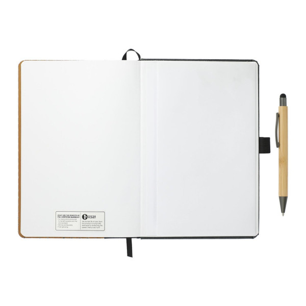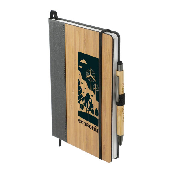 The FSC® Bamboo Bound Journal Bundle Set includes the 5.5'' x 8.5'' FSC Mix Bamboo Bound Journal (2800-78) and Bamboo Quick-Dry Gel Ballpoint Stylus (1066-50). It features a unique bamboo cover with recycled leather accent. 80 sheets of FSC® white lined paper. Includes elastic closure, ribbon page marker and elastic pen loop. Through a partnership with 1% For The Planet, one percent of sales of all EcoSmart® products are donated to environmental nonprofits. Due to the nature of the material, there may be color variances.