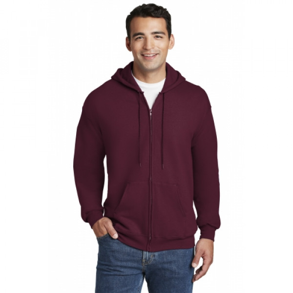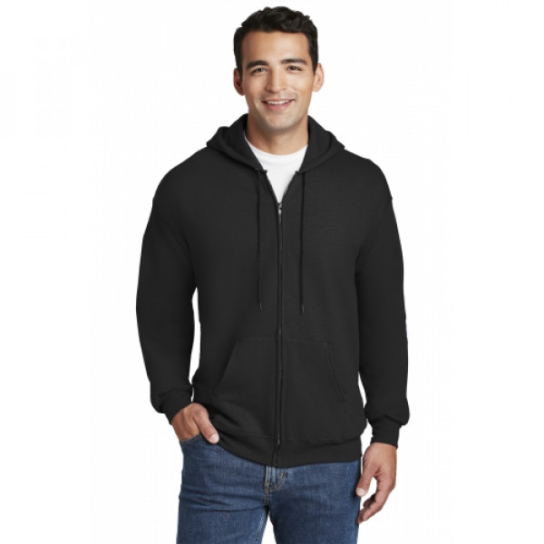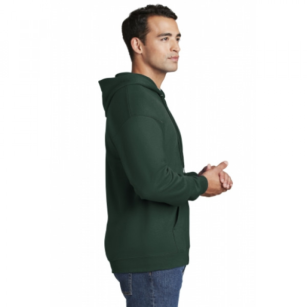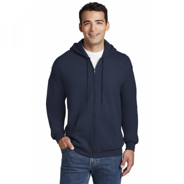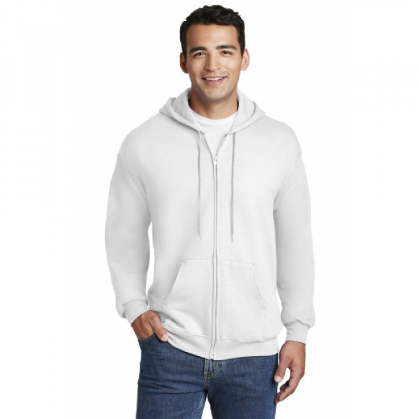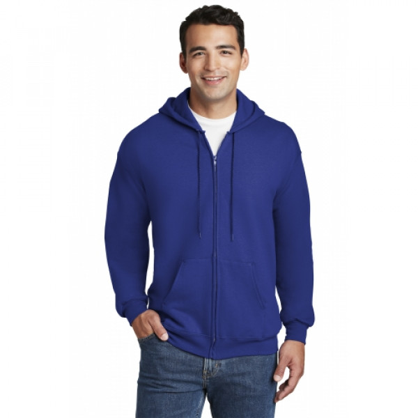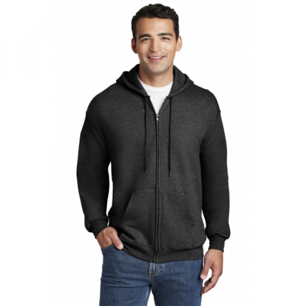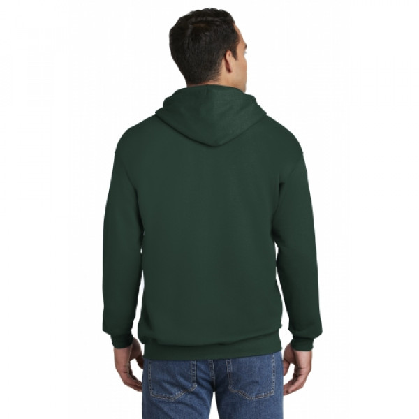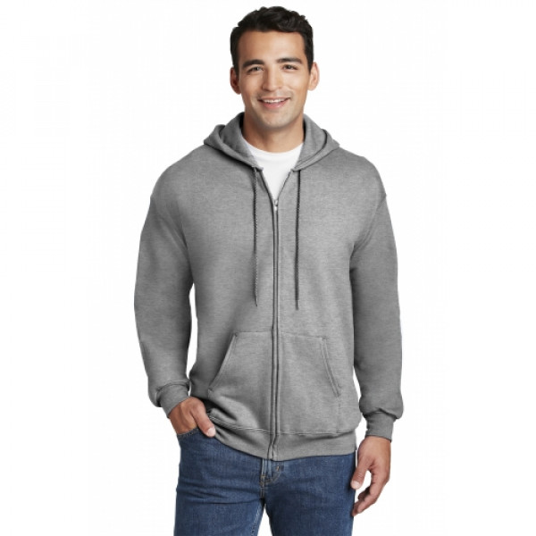 10-ounce 90/10 cotton/poly PrintPro XP fabric; 100% cotton face Jersey-lined hood with grommets and drawcord Set-in sleeves Front pouch pockets Coverseamed waistband Hanes EasyColor program haneseasycolor.comLight Steel is 85/15 cotton/poly.