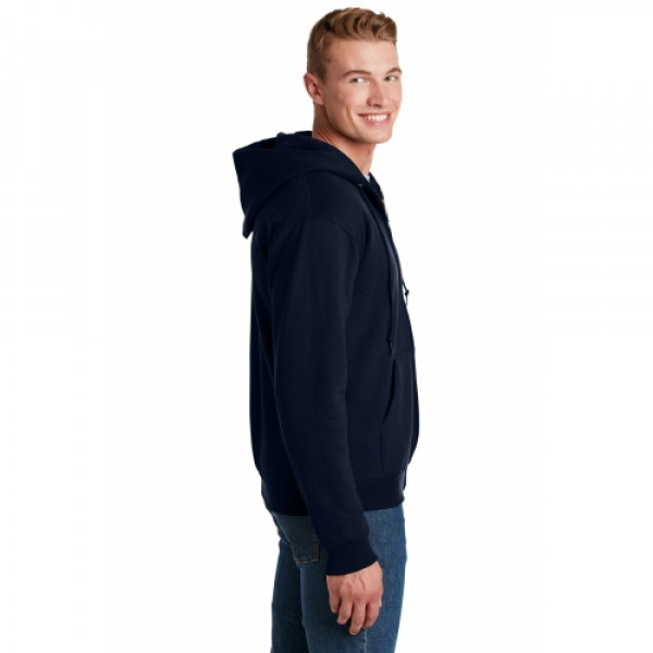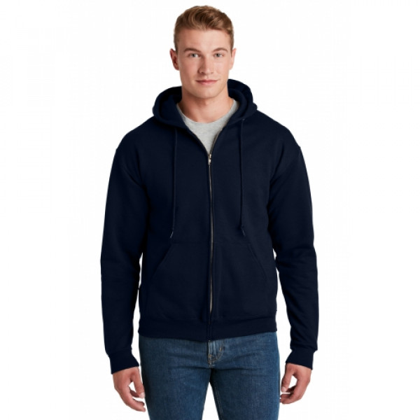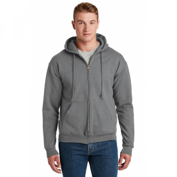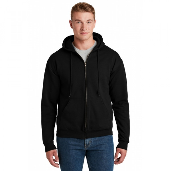 9.5-ounce 50/50 cotton/poly NuBlend preshrunk pill-resistant fleeceHigh stitch density for a smooth printing canvas Double-ply hood with grommets Seamless body with set-in sleeves 1x1 rib knit cuffs and waistband with spandex Double-needle coverseamed neck armholes and waistband Front pouch pockets